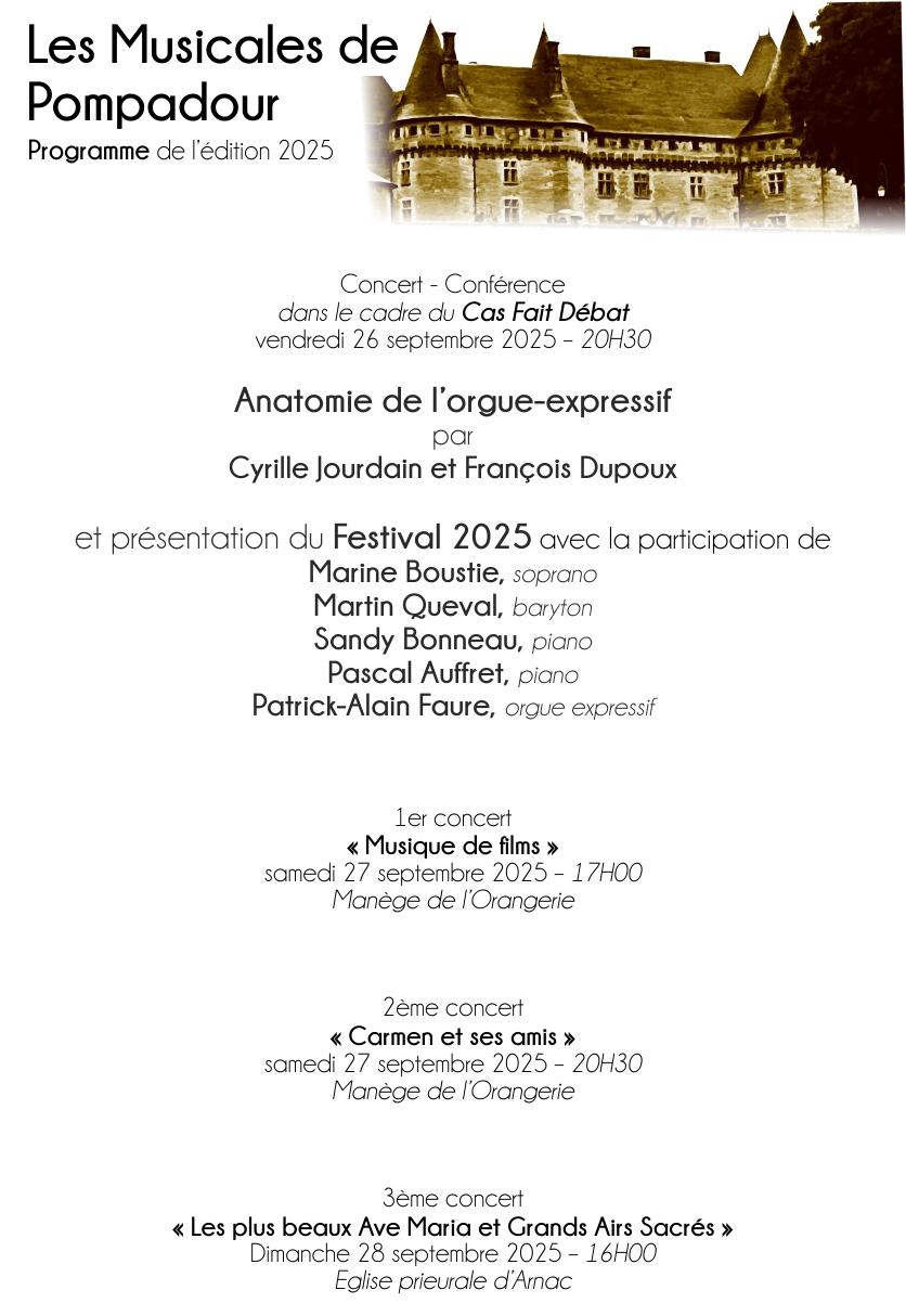 Les 26, 27 et 28 septembre 2025, la Municipalité de Pompadour et le Château de Pompadour organisent, en collaboration avec L’harmonium français, la deuxième édition du Festival « Les Musicales de Pompadour ». Cette année le programme sera consacré à la Musique de Film, à l’Opéra et à la Musique Sacrée.