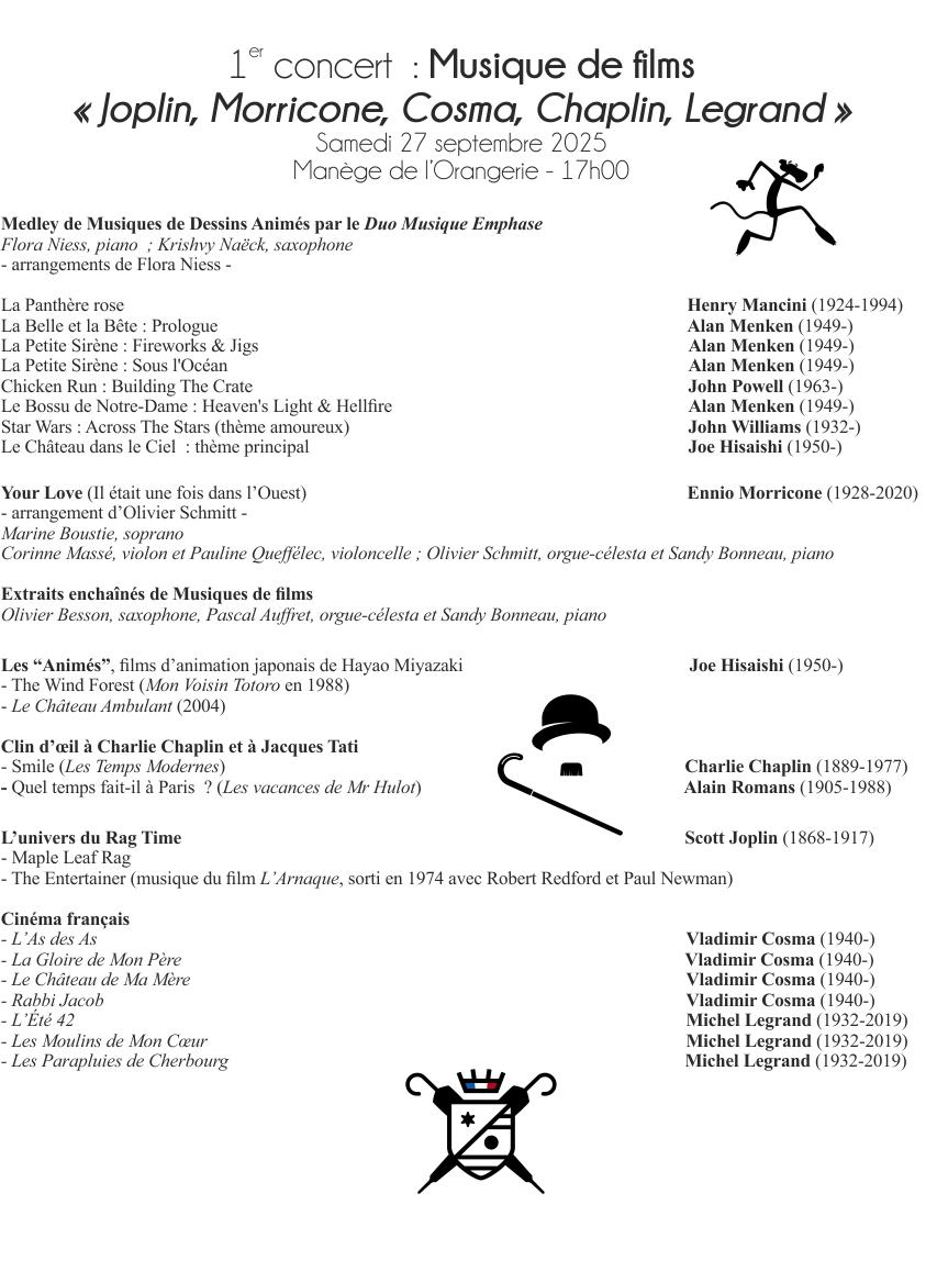 Œuvres de : Cosma, Morricone, Legrand, Chaplin, Bizet, Rossini, Mascagni, Saint-Saëns, Franck, Gounod, Schubert.