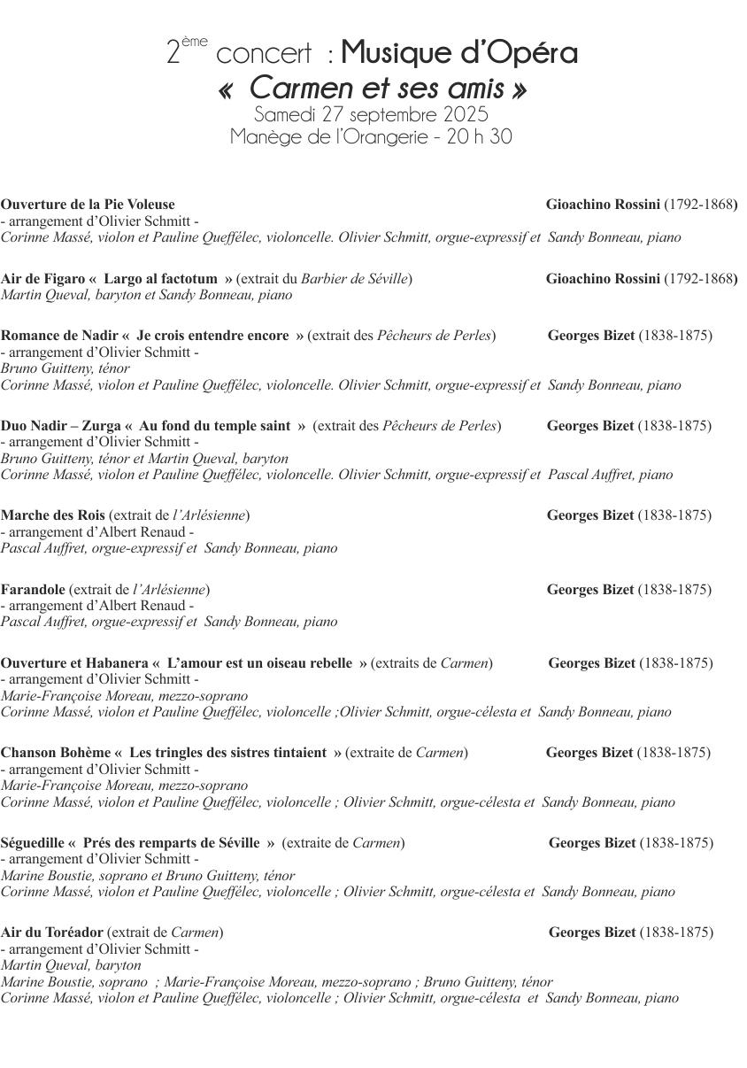 Le samedi 27 septembre, deux concerts se dérouleront dans le Manège de l’Orangerie du Château de Pompadour avec une disposition du public autour des musiciens. Cette innovation permettra d’avoir, comme dans un salon, le public au plus près des artistes. Le concert de 17 heures vous permettra de retrouver les grands standards de la Musique de Film avec notamment les œuvres d’Ennio Morricone, de Vladimir Cosma et de Michel Legrand. Le deuxième concert aura lieu à 20H30 et se nommera « Carmen et ses amis». Il fera la part belle à l’Opéra avec les œuvres de Georges Bizet (Carmen, L’Arlésienne et les Pêcheurs de Perles) et de Giacomo Rossini (La Pie voleuse et Le Barbier de Séville).