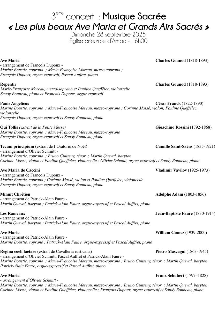 Le lendemain, dimanche 28 septembre, le troisième concert intitulé « Les plus beaux Ave Maria et Grands Airs sacrés » aura lieu à 16 heures dans la magnifique Prieurale d’Arnac qui sublimera les pièces les plus célèbres de Gounod, Schubert, Franck, Mascagni, Rossini et Saint-Saëns.